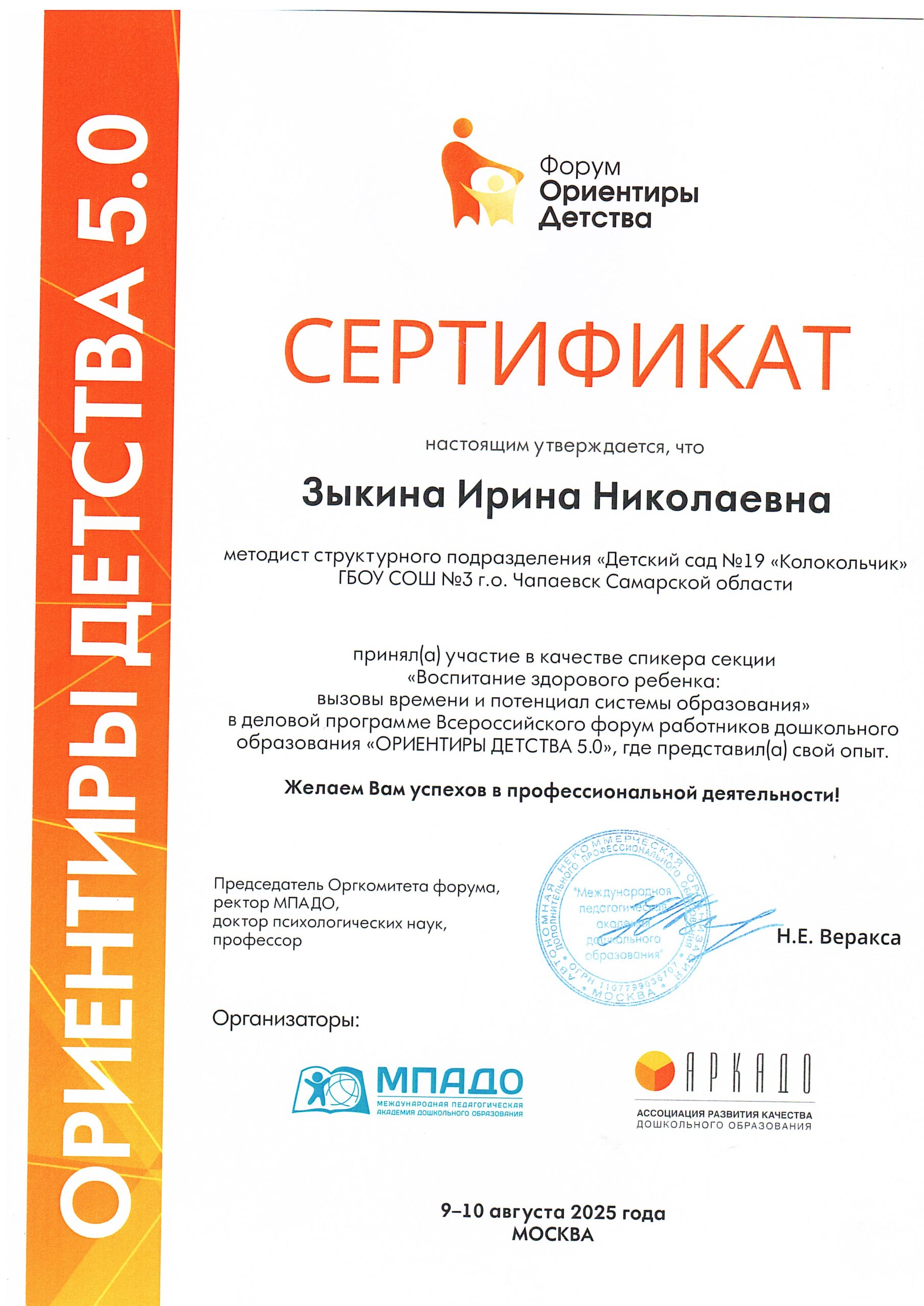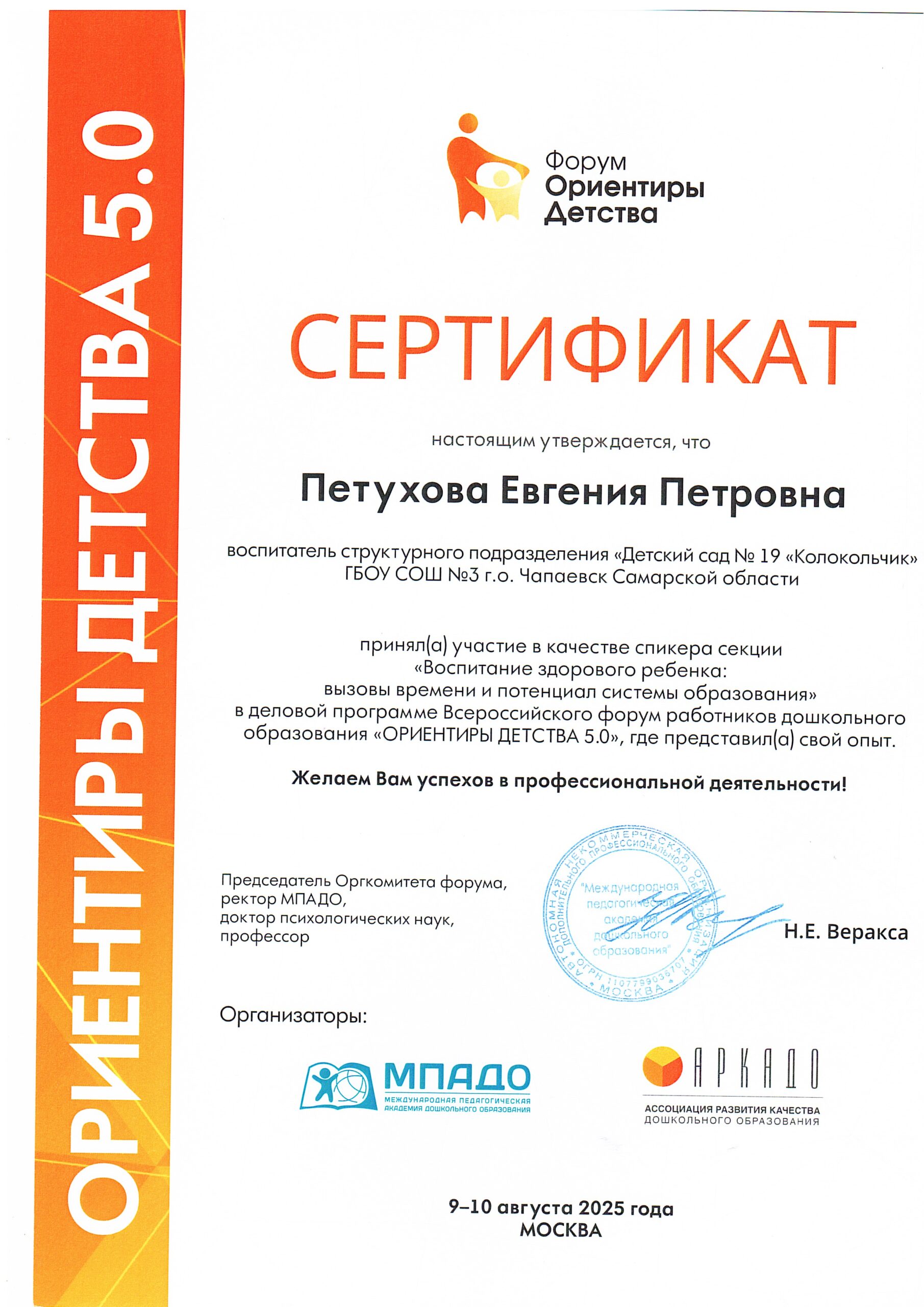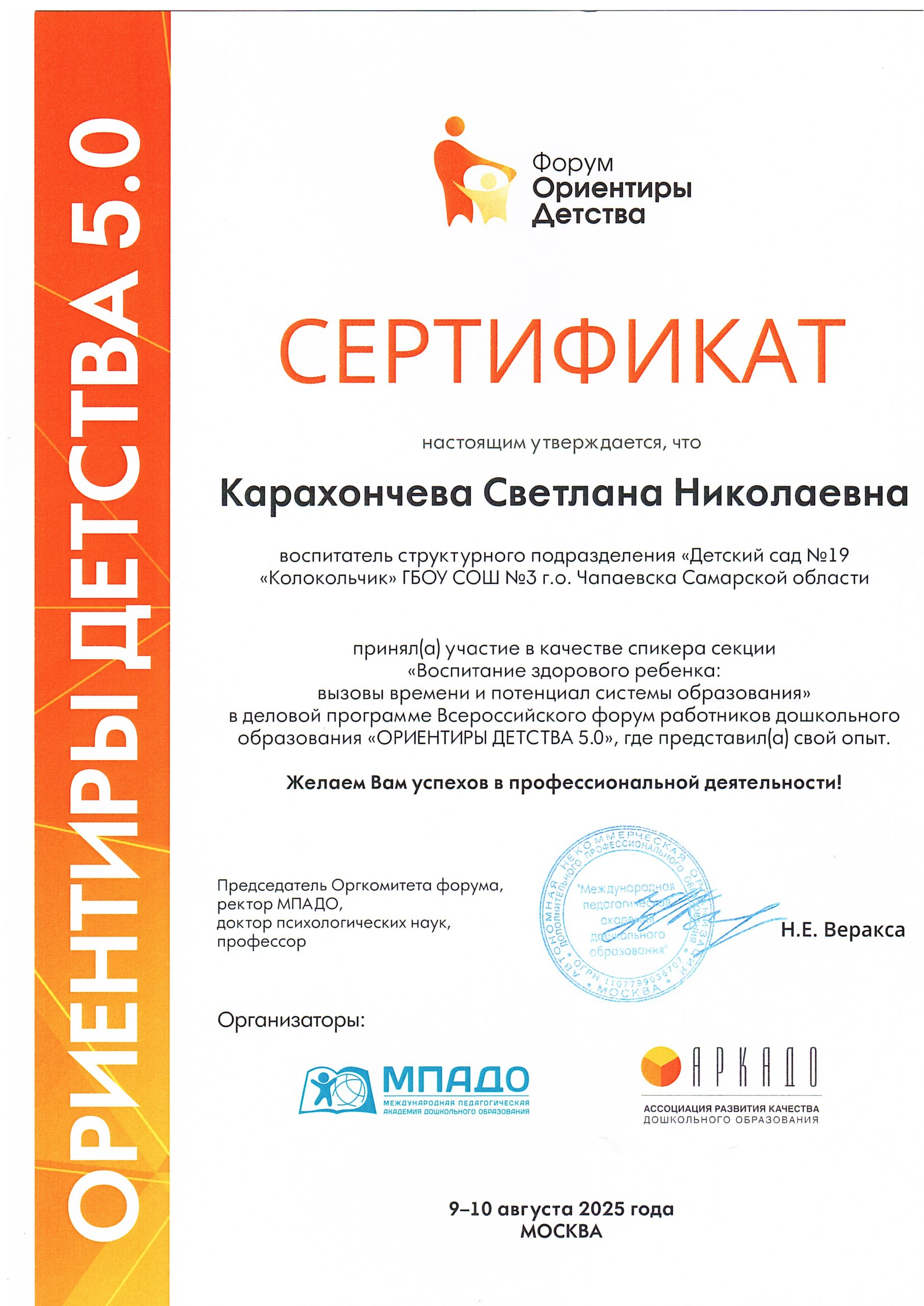 9-10.08.2025 г. Москва состоялся Всероссийский форум работников дошкольного образования «Ориентиры детства 5.0». В работе секции «Воспитание здорового ребёнка: вызовы времени и потенциал системы образования», приняли участие педагоги СП Детский сад № 19 «Колокольчик» ГБОУ СОШ №3 г.о. Чапаевск: методист Зыкина И.Н., воспитатели: Петухова Е. П., Карахончева С.Н. с презентацией опыта работы «Методика формирования элементарных туристских навыков».